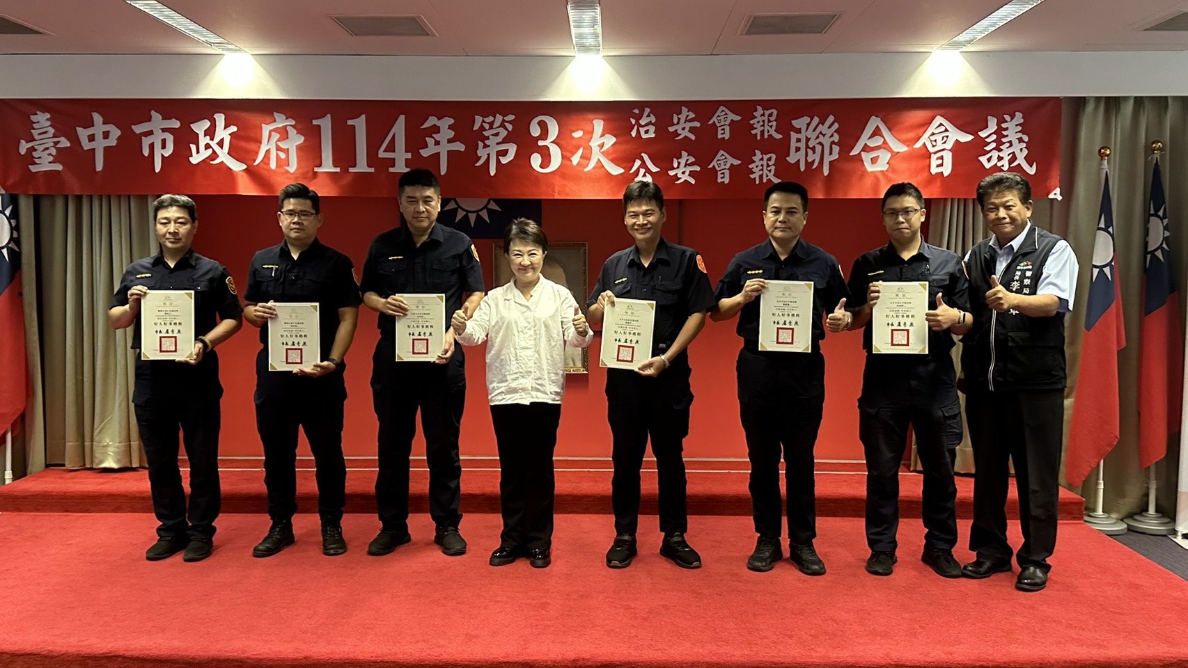 盧市長表示,臺中市治安工作一直以來表現都非常亮眼,市政團隊也會繼續努力,守護治安平穩的成果,期許市府團隊持續精進,共同守護市民安全的生活環境。