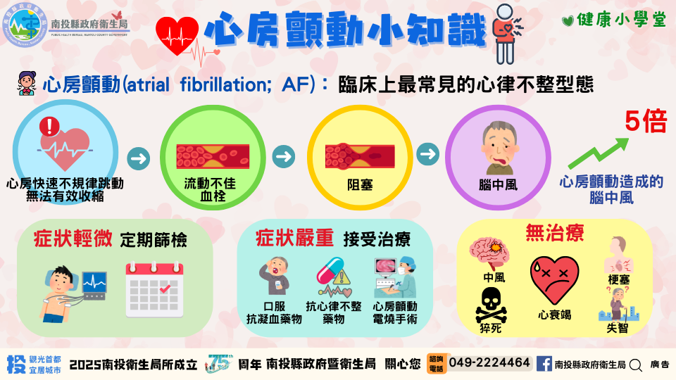 衛生局再次呼籲民眾踴躍篩檢,把握早期發現的黃金時機,降低中風風險,一起「守護心律,預防中風」,用行動守住健康的每一次心跳,民眾如有心房顫動篩檢及諮詢需求可洽13鄉鎮市衛生所協助。另縣府衛生局也提供-心房顫動(AF)手冊供民眾參閱,或查詢縣府衛生局網站https://www.ntshb.gov.tw/首頁/便民服務/衛教宣導圖卡/醫療資源。