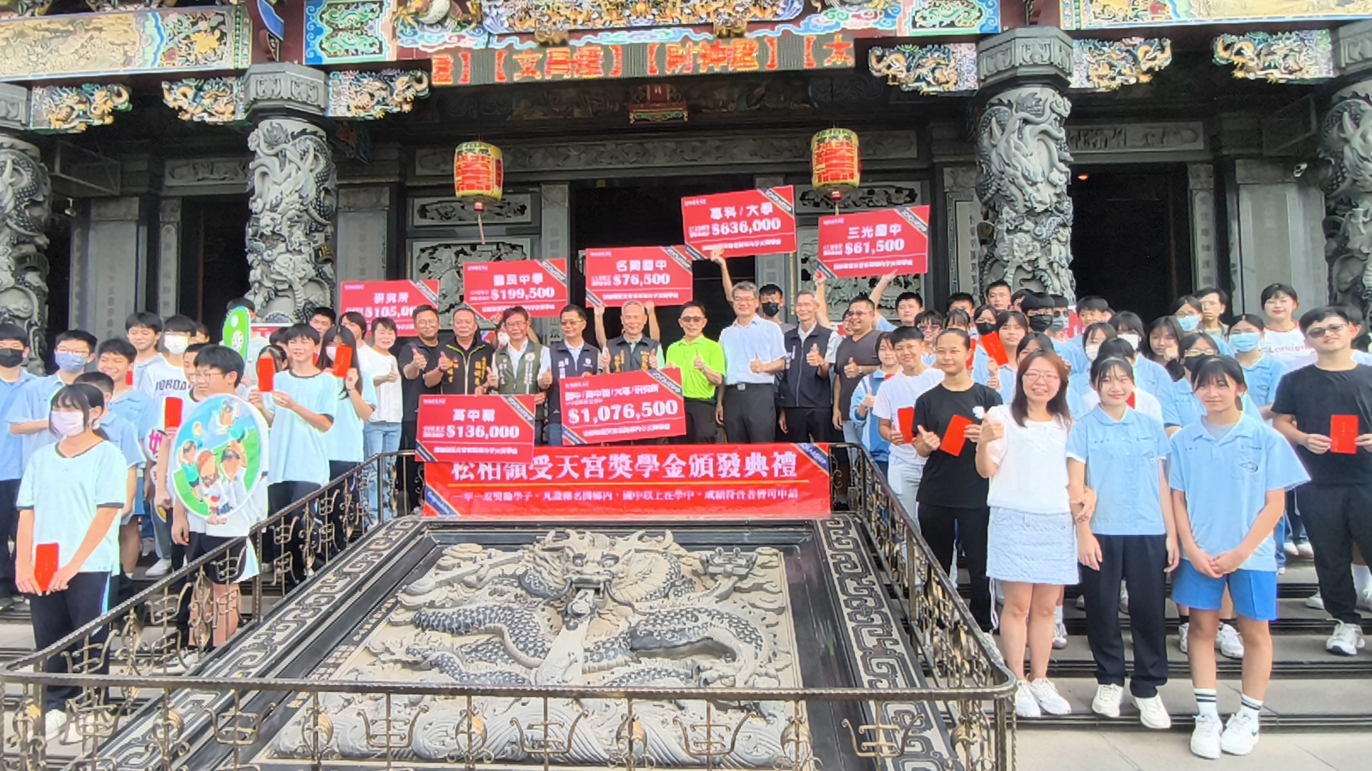活動邀請受獎學生,入廟參拜後,至廟前舉行頒發儀式, 除了邀請獲獎學生與家長共同參與外,受天宮亦準備了文創小禮物,鼓勵學子返鄉領獎,此次頒發獎助學金,總金額一百餘萬元, 受天宮更每年將十方善款投入名間鄉內學校的學雜費補助,總計約新台幣五百萬元。