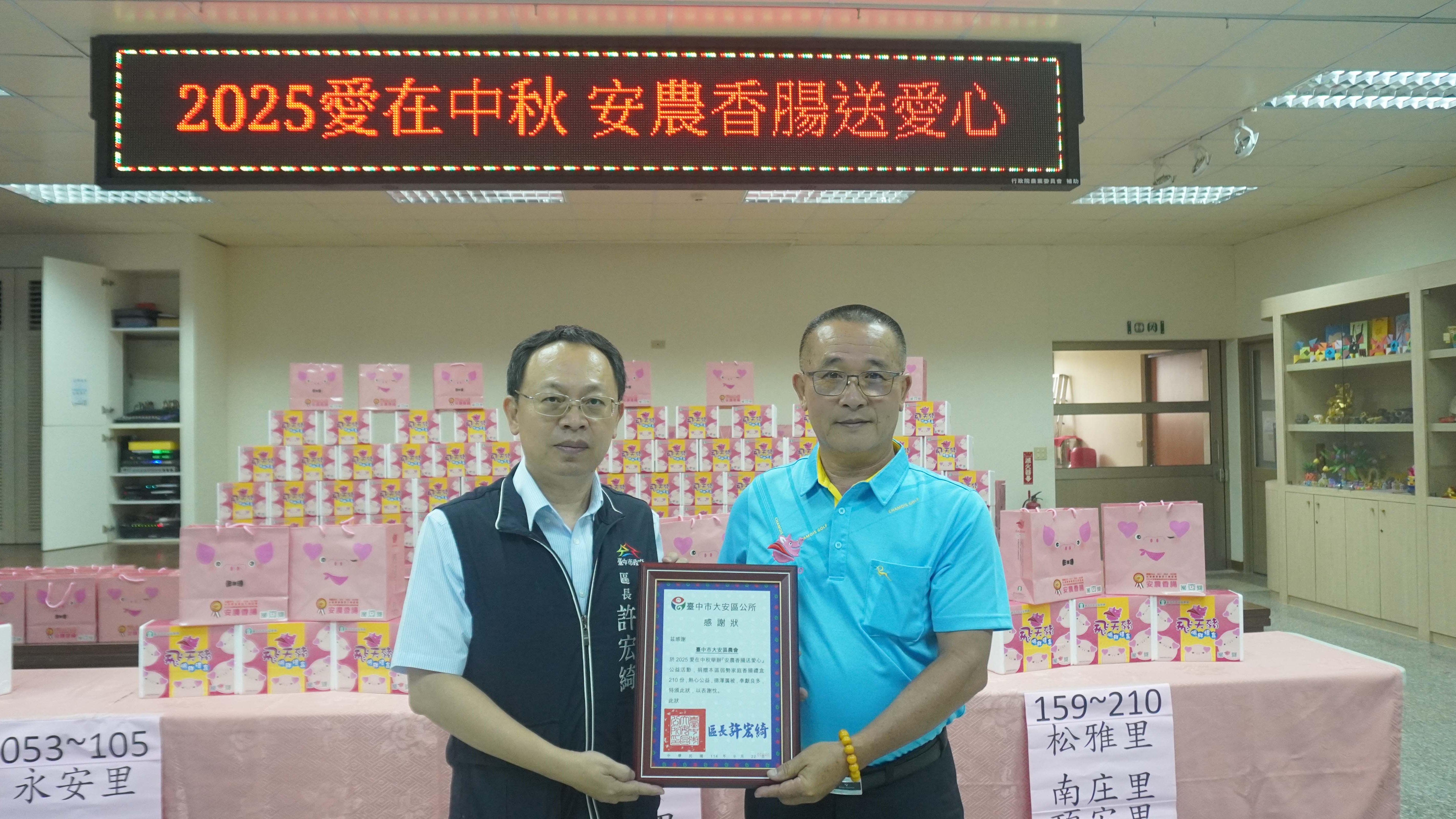 (特派員廖廣學 台中報導)中秋佳節即將到來,臺中市大安區農會於22日在本會4樓舉辦「2025愛在中秋,安農香腸送愛心~安心呷.農為您」公益活動。今年活動已邁入第11年、累計第21次舉辦,持續以「你買、我捐」的模式,透過消費結合公益,為弱勢家庭送上滿滿祝福與佳節溫暖,讓大家都能過一個團圓溫馨的中秋。