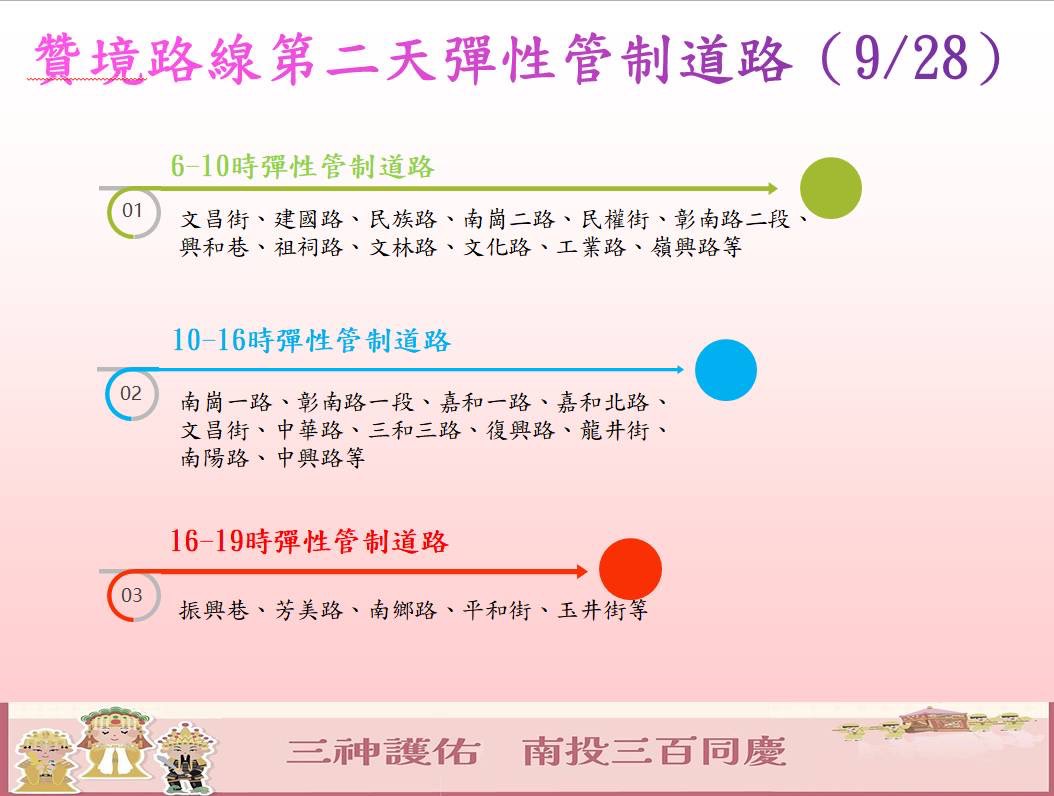 (3) 9月28日(星期日):文昌街、建國路、民族路、南崗二路、民權街、彰南路、興和巷、祖祠路、文林路、文化路、嶺興路、工業路、南崗一路、嘉和一路、中興路、嘉和北路、中山街、三和三路、復興路、龍井街、南陽路、振興巷、芳美路、南鄉路、平和街、玉井街(以上均包含道路,並視人潮彈性管制周邊道路)。
