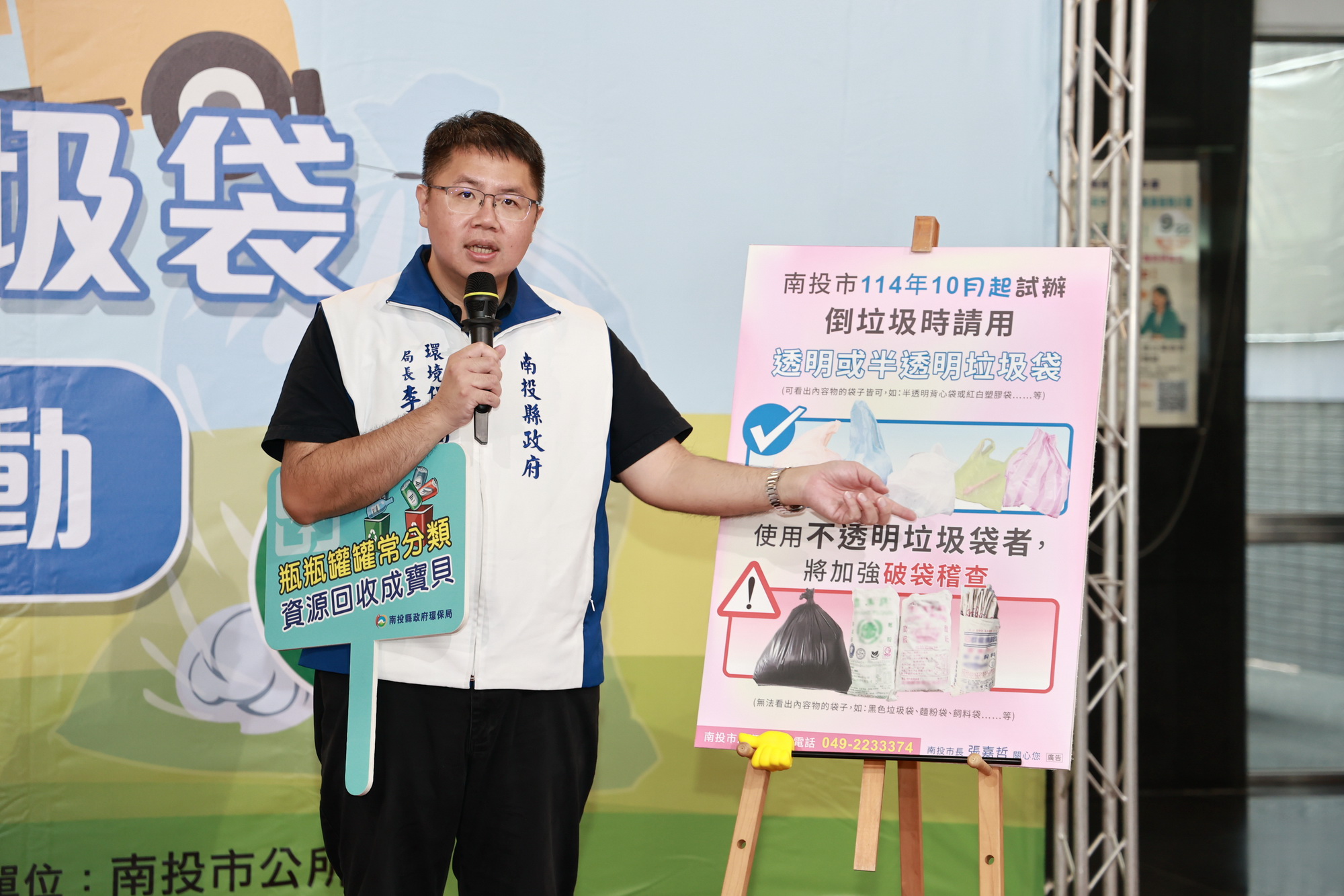 (特派員廖廣學 南投報導) 為強化民眾垃圾分類的觀念與行動,縣府與南投市公所合作,10月1日起率先於南投市啟動「加強不透明垃圾袋破袋檢查」工作,提醒民眾盡量使用透明塑膠袋並做好垃圾分類工作,縣府環保局30日於縣府一樓大廳辦理記者會說明,呼籲民眾配合,落實垃圾分類。