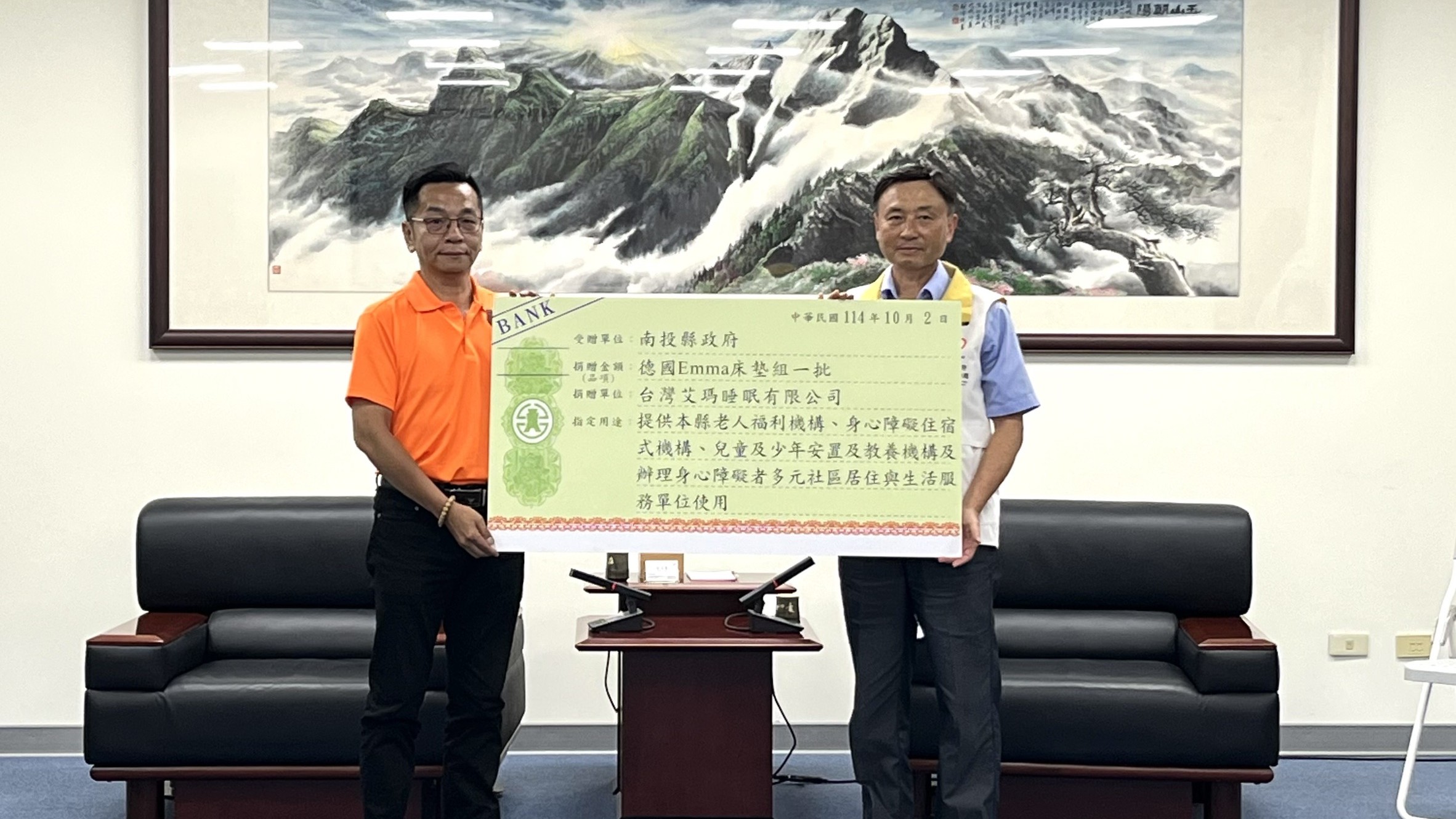 (特派員陳錦玲 南投報導) 為協助本縣弱勢民眾,提升照顧服務品質,台灣艾瑪睡眠有限公司捐贈德國Emma床墊組一批,10月2日上午在縣府縣長會客室舉行捐贈儀式,由社會及勞動局長林志忠表接受並致贈感謝狀,林局長感謝台灣艾瑪睡眠有限公司善心捐贈,將提供縣內身心障礙住宿式機構、老人福利機構、兒童及少年安置及教養機構及多元社區居住與生活服務方案單位運用。