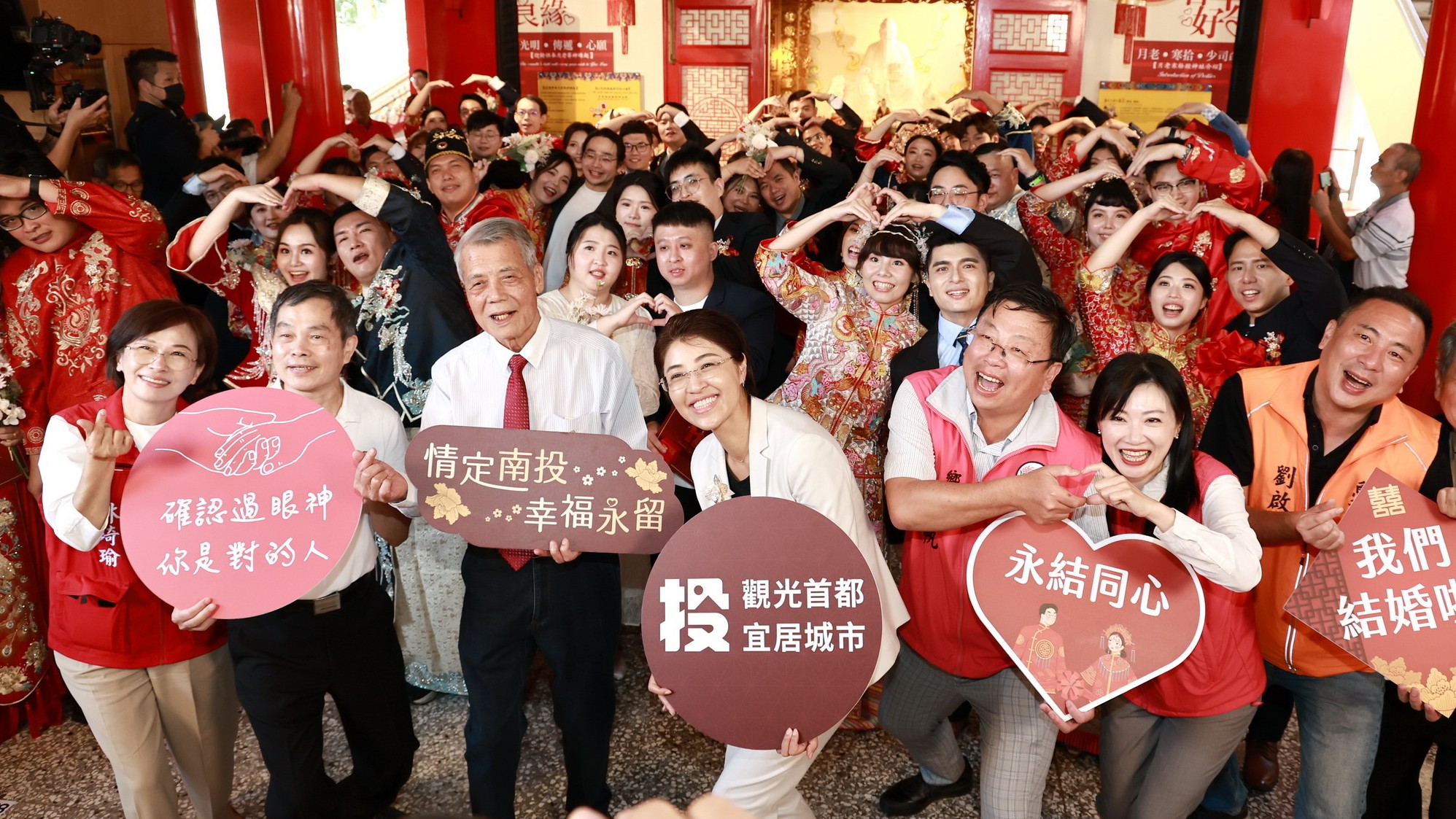 (特派員廖廣學 南投報導) 縣府17日在日月潭文武廟舉辦集團婚禮,30對新人在月老面前許下終身承諾,縣長許淑華到場見證,縣府貼心準備了由紫南宮土地公身上金牌所打造的「金戒指」,送給新人雙方的交換信物,希望能為每一對新人帶來平安富貴與長長久久的幸福。