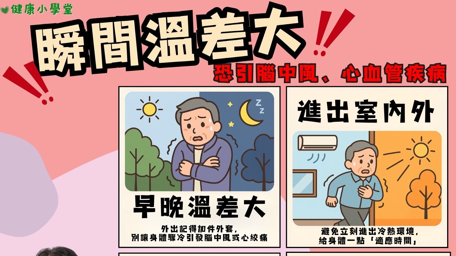 1.清晨與夜晚氣溫最低時:起床前先在被窩內活動四肢,穿上保暖衣物再下床,外出記得加件外套,別讓身體驟冷引發腦中風或心絞痛。