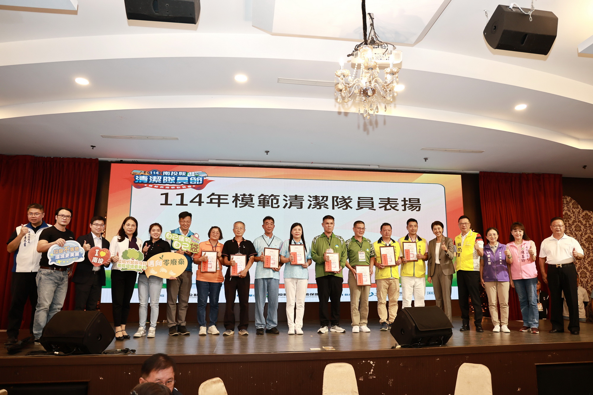 (特派員廖廣學 南投報導)為感謝縣內基層環保人員的辛勞,縣府10月22日於南投市南島婚宴會館,舉辦盛大的「114年度南投縣清潔隊員節及模範表揚聯歡餐會」,全縣近700位清潔隊員齊聚一堂,縣長許淑華到場頒獎表揚模範清潔隊員及考核績優鄉鎮市公所等獎項,並感謝大家平時收運垃圾及維護環境清潔的辛勞和貢獻,合力打造美好生活環境。