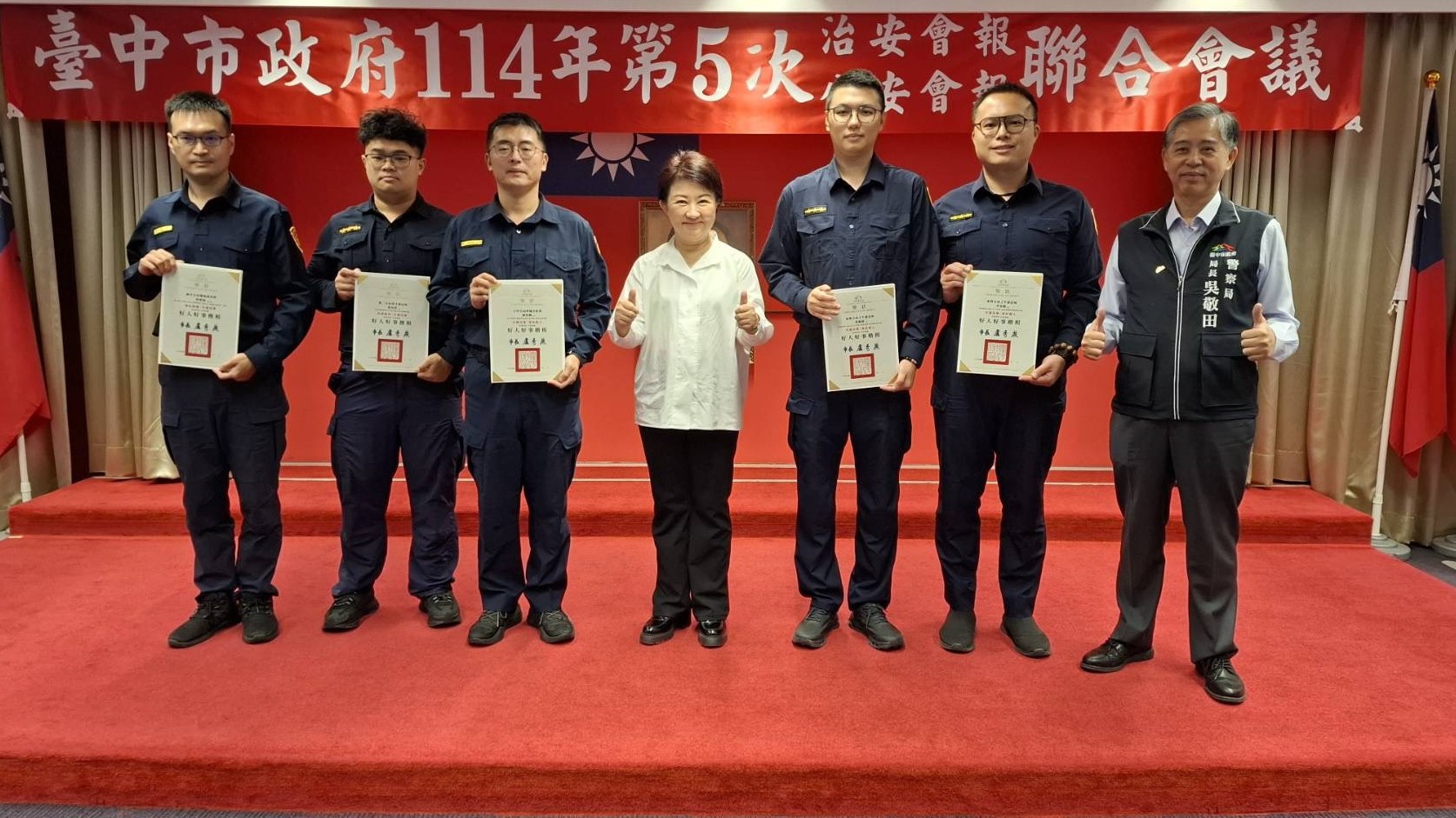 臺中市長盧秀燕於治安會議中頒發「臺中市成功攔阻詐騙案件有功人員」感謝狀,表揚金融機構人員、地政人員、員警。特別感謝銀行、超商以及民間團體長期配合協助警方打詐,本次受獎人員台新國際商業銀行逢甲分行張經理已憑機警細心多次阻詐成功,單次阻詐最高金額更達1,400萬元。統計指出,臺中市警方成功攔阻的詐騙金額比去年同期增加了2億元,顯示阻詐成效卓著。根據打詐儀錶板最新統計,臺中市今(114)年8月受理詐欺案件2,228件,財損約11億元;9月案件數降為2,033件,財損亦減少到9億元,與去年同期比較(113年9月),詐欺財損更大幅下降38%。數據顯示,在政府、警方與民間共同努力下,打詐工作已見成效,未來亦會持續強化防詐宣導,守護市民的每一分血汗錢。