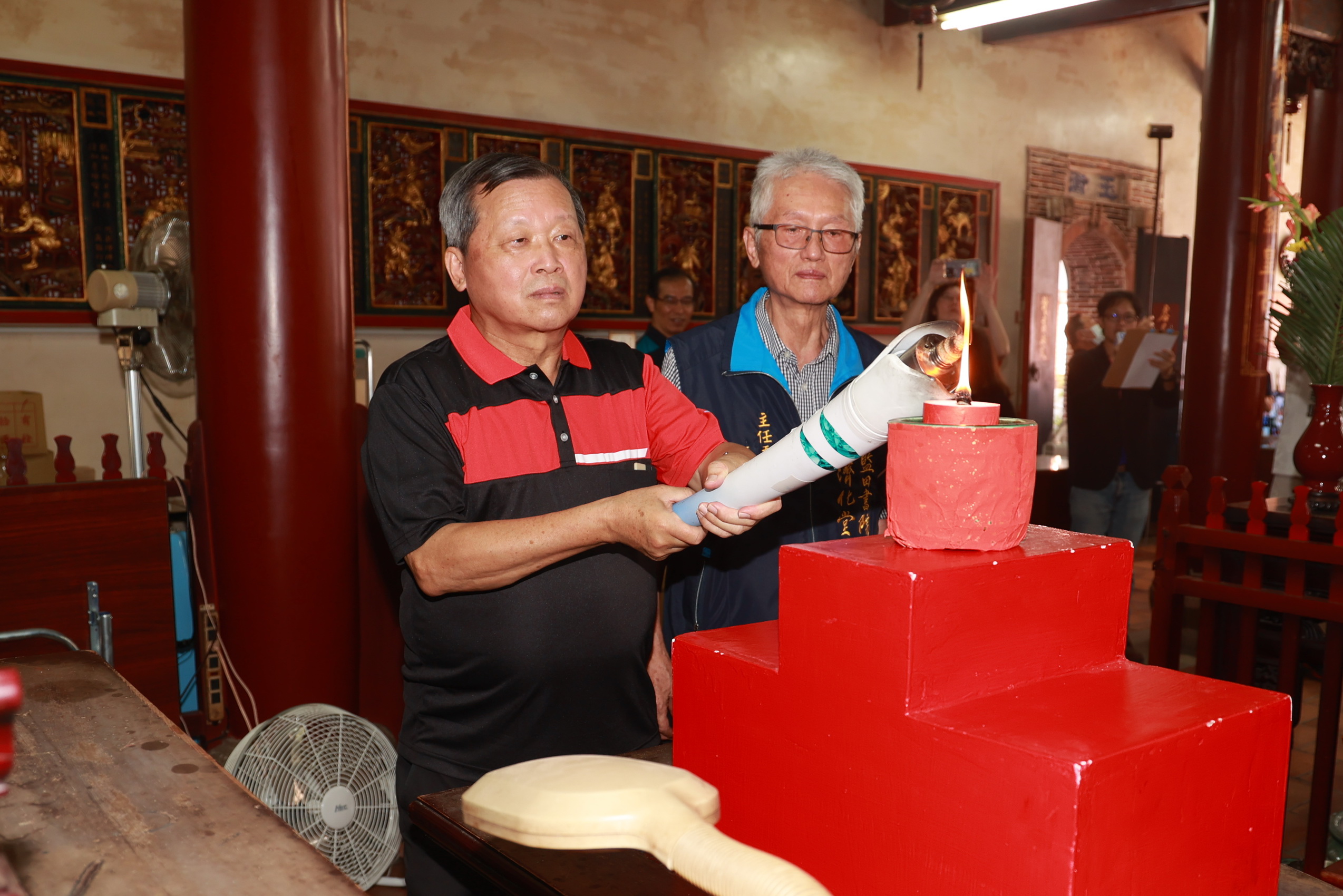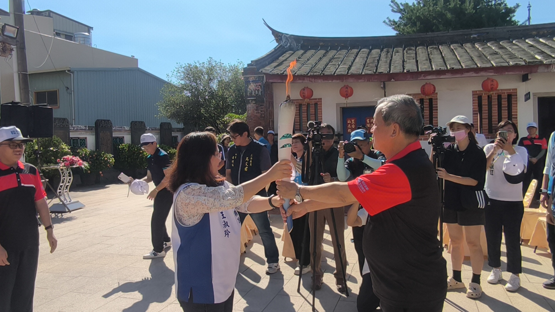 藍田書院是南投縣重要古蹟,點燃聖火,由南投縣副縣長王瑞德主持,燃火前禮敬、上香、莊重肅穆。立委麥玉珍、南投市長張嘉哲、縣議員張秀枝、簡千翔等人到場參加。