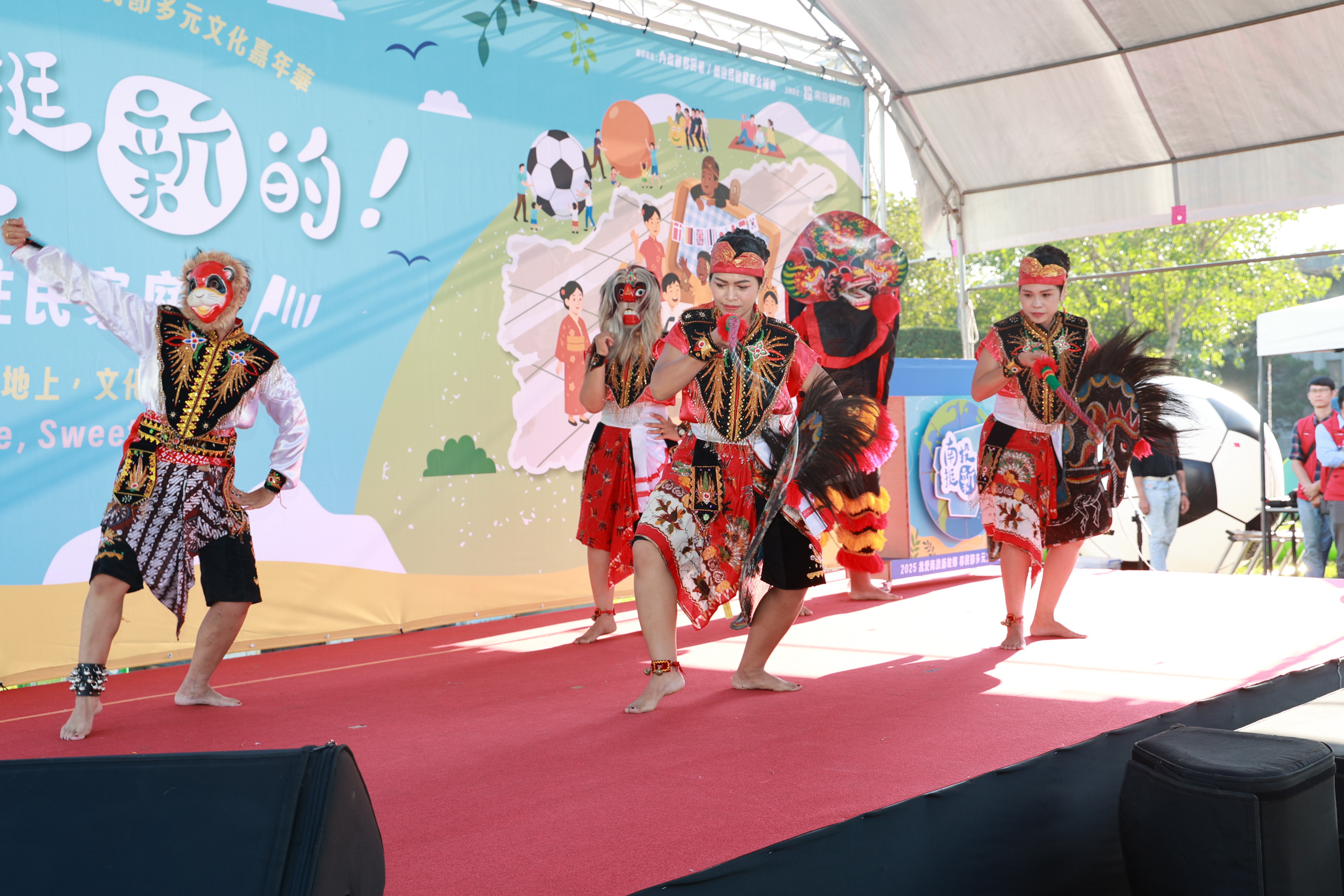 新住民家庭日開場活動,由「美樂迪舞蹈團」帶來氣勢恢宏的印尼戰馬舞,舞台以巨型地球意象為背景,象徵全球文化在南投美麗交融。