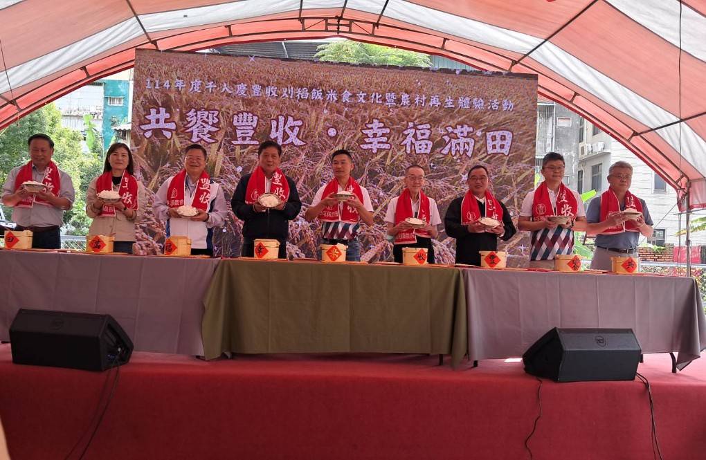 (記者廖廣學 邱暐茹)由南投縣政府與草屯鎮農會共同舉辦的「共饗豐收・幸福滿田」千人慶豐收刈稻飯米食文化活動,13日在敦和宮大型停車場隆重登場。由農會理事長林昆熠主持,包括農業處長蘇瑞祥.草屯鎮長簡賜勝,議員唐曉棻及眾多佳賓等到場參與,慶祝農會推動「富麗、安康、永續」政策願景的重要成果展現。