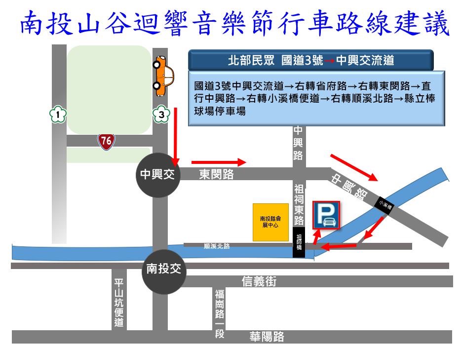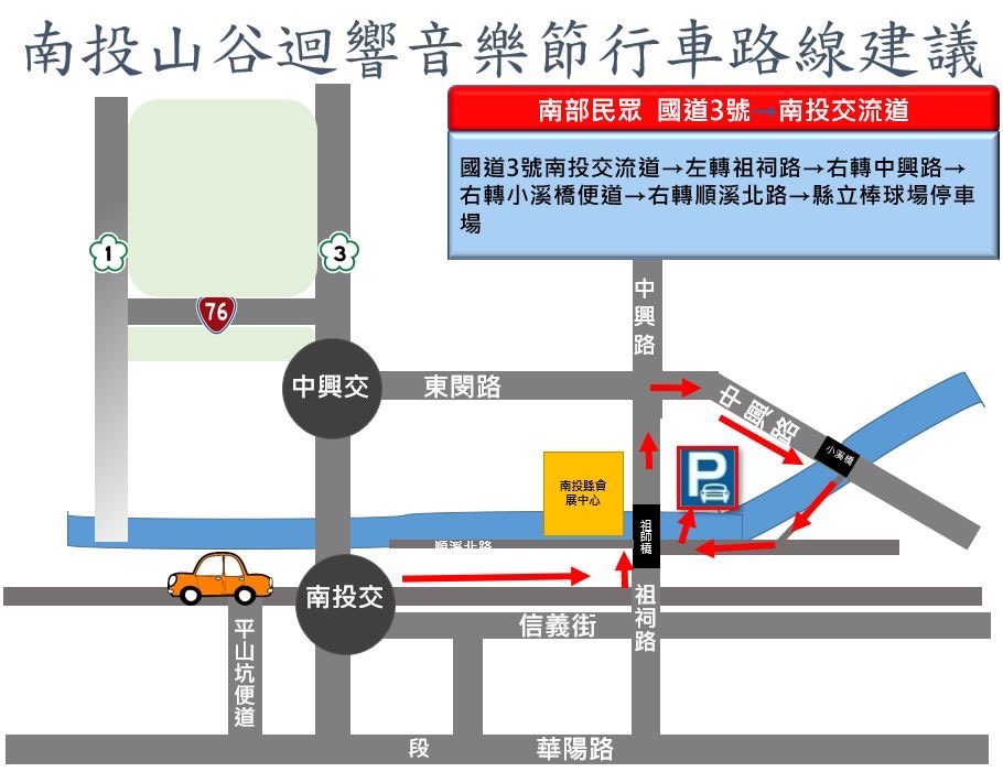 南部民眾由國道3號南投交流道→迴轉信義街→左轉祖祠路→右轉中興路→右轉小溪橋便道→右轉順溪北路→右轉縣立棒球場停車場。