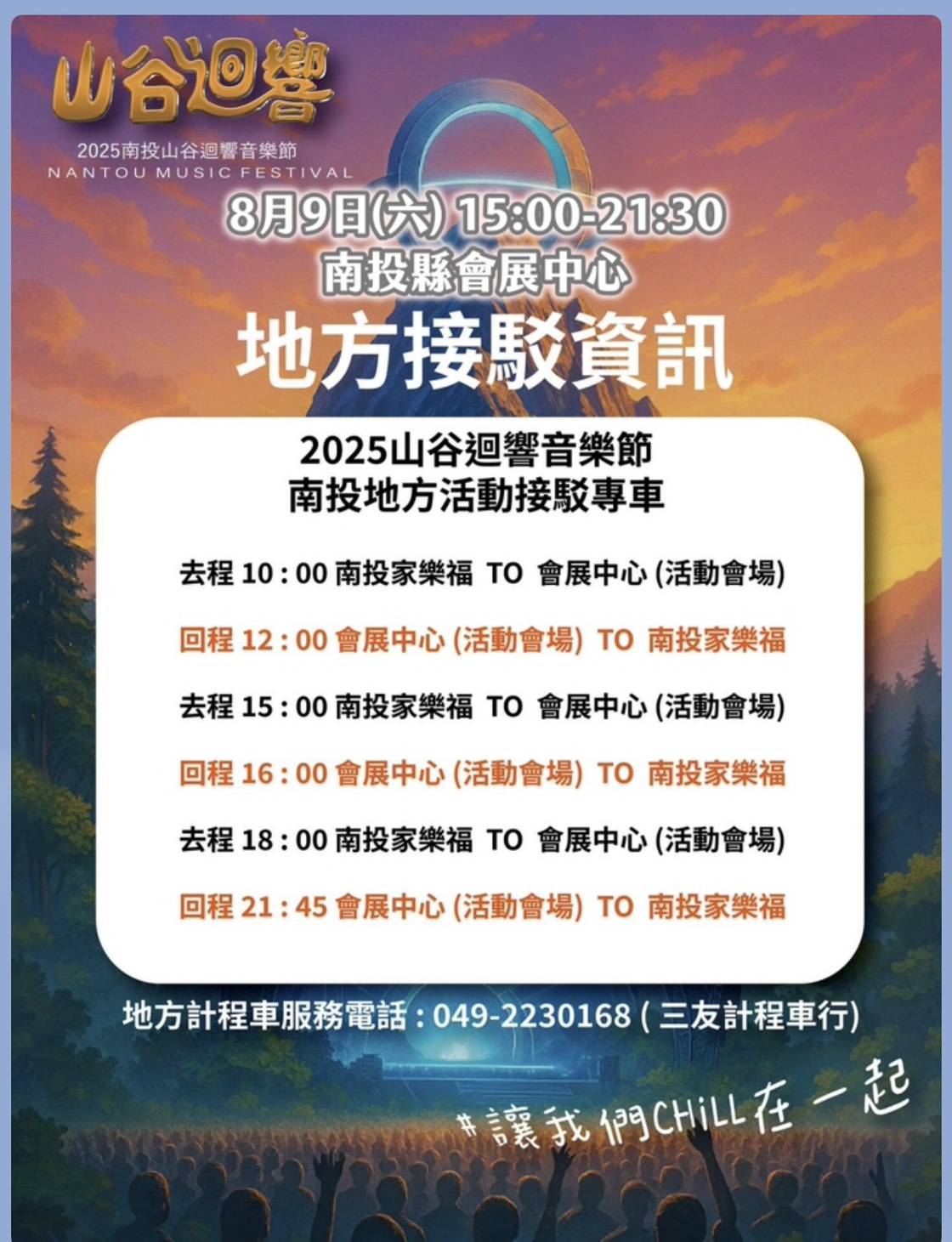 (特派員廖廣學 南投報導)南投音樂盛宴 2025南投山谷迴響音樂節8月9日(六)15時至21時30分,將在南投縣會展中心隆重登場,南投縣政府為確保活動期間交通順暢與安全,公告部分路段實施交通管制: