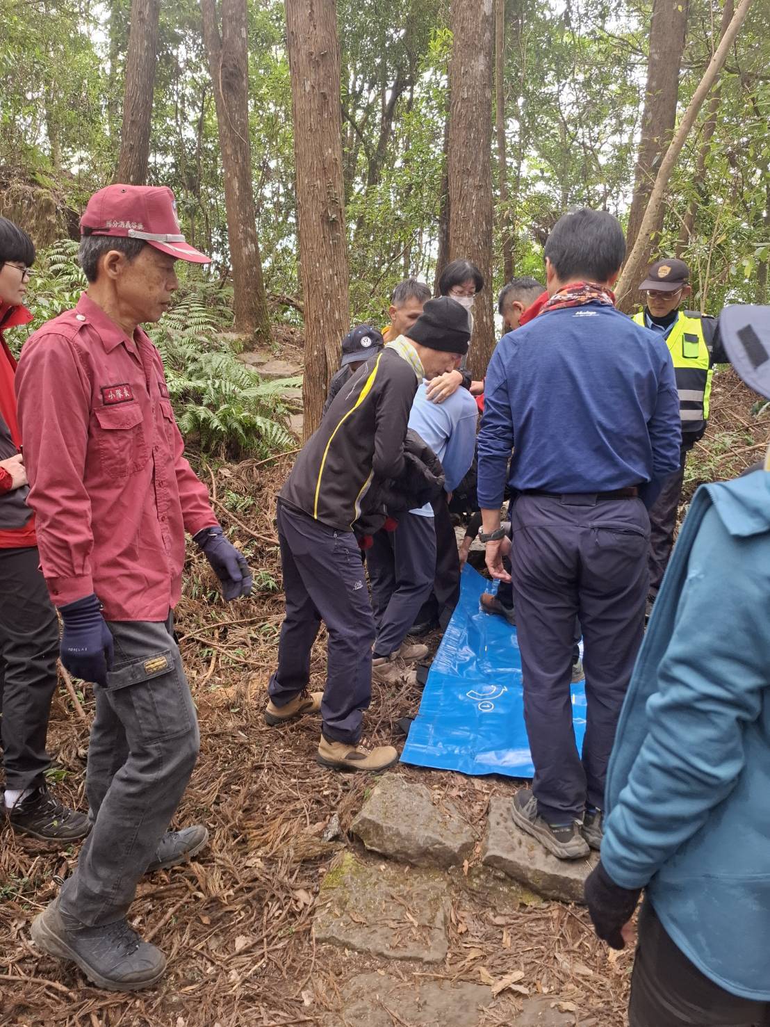 救護人員迅速檢查並持續監測生命徵象,發現患者意識清楚,生命徵象穩定,身上無明顯外傷,唯肢體無力無法自行行走並有些許失溫現象。經現場評估,並給予保暖衣物處置後,由現場人員合理利用搬運毯搬運下山。駕駛於12時20分由救護車送往鄰近竹山秀傳醫院急診就醫。