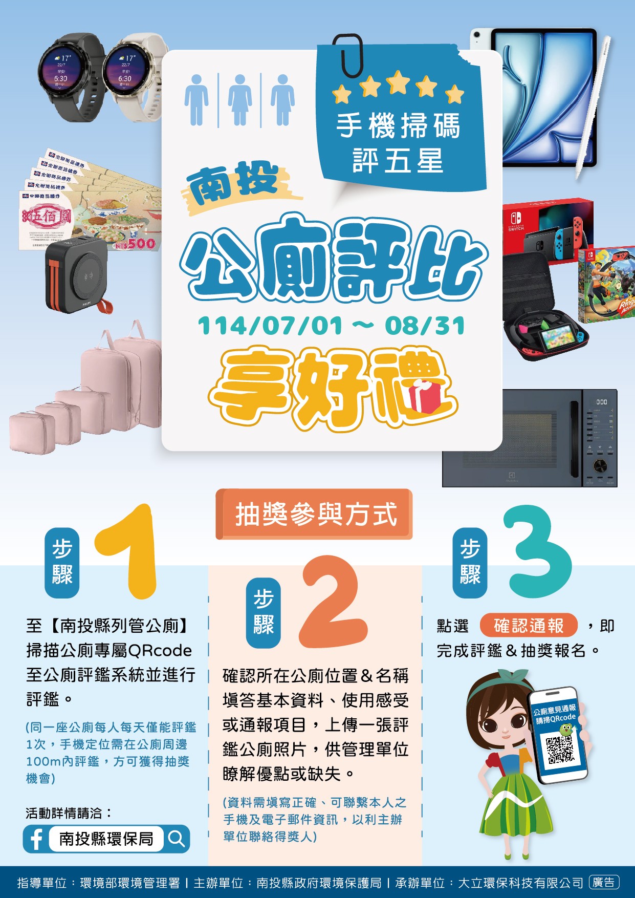 活動期間,民眾僅需使用本縣1,120座列管公廁任一座後,掃描廁所內的專屬QR Code,即可進入評鑑系統,評價公廁滿意度並填寫需改善之問題,讓管理單位即時掌握公廁現況。每次成功提交評價,還有機會參加抽獎活動,每個手機門號針對1座公廁評鑑即可獲得1次抽獎機會,1個手機門號1天最多累計6次抽獎機會。獎品豐富,包括iPad、Switch、Garmin智慧型腕表、家電用品及禮券等共68項大獎。