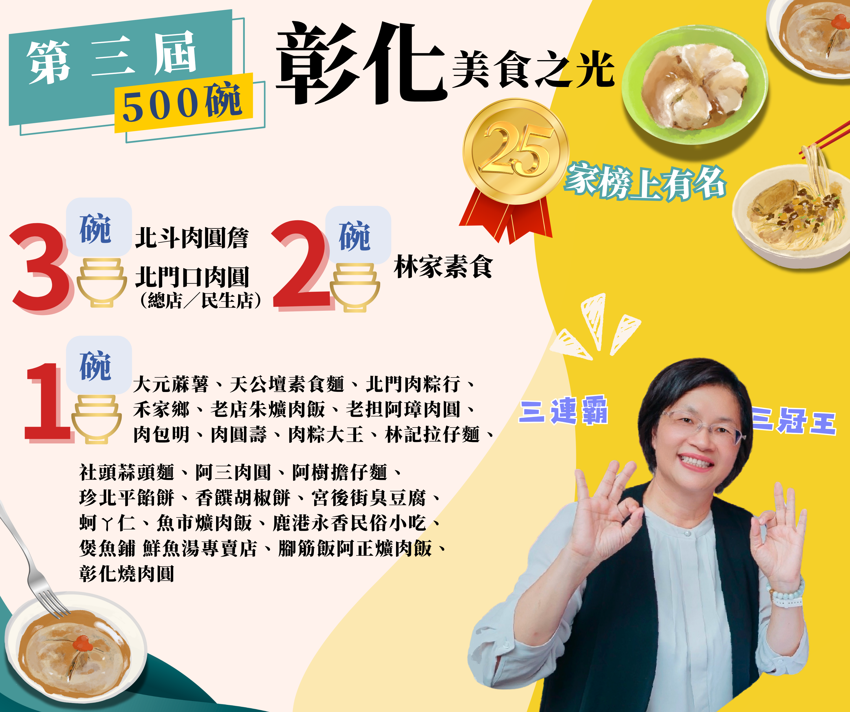 (記者邱暐茹 彰化報導)第三屆《500碗》美食大獎已揭曉,今年全台共有462家優秀店家入選,全台競爭激烈,彰化縣長王惠美恭賀彰化美食25家榜上有名,特別是僅有5家業者榮獲最高榮譽的「三碗」殊榮,彰化縣就有兩家上榜,分別是彰化市的「北門口肉圓(總店/民生店)」與北斗鎮的「北斗肉圓詹」,再次印證彰化在台灣小吃界的指標性地位。另外,彰化市的「蚵ㄚ仁」與「老担阿璋肉圓」也再次入榜,並成功連續三屆榮登《500碗》榜單,達成「三連霸」佳績,可見尚好吃的美食在彰化,展現彰化縣小吃的獨特魅力,王縣長肯定為彰化美食之光。