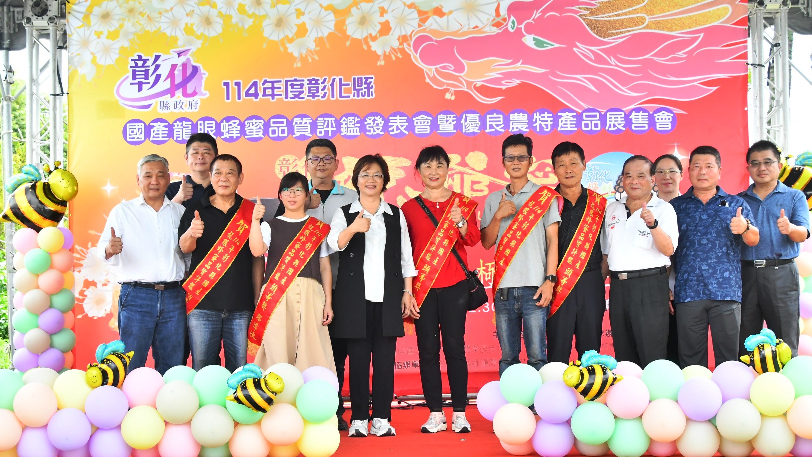 (記者邱暐茹 彰化報導)為加強推廣彰化蜂蜜,員林市農會今(10)日上午在琉璃仙境舉辦114年彰化縣國產龍眼蜂蜜品質評鑑發表會暨員林市農特產品展售會。彰化縣長王惠美、農業部農民輔導司長陳俊言與員林市農會理事長張永鑫、常務監事王錫庸、總幹事黃豐盛等貴賓頒發匾額表揚第四屆蜂蜜評鑑得獎者,王縣長表示,感謝員林市農會及各界的用心推廣,也恭喜 20 位得獎蜂農,今年蜂蜜產量創下近10年新高,更是去年的10倍,是甜蜜的大豐收,今天員林市農會特別安排展售得獎蜂蜜,推出「買三送一」的優惠,也歡迎大家把握當季的好機會多多選購,龍爺覓好禮, 極品好蜜在彰化,送禮自用兩相宜。