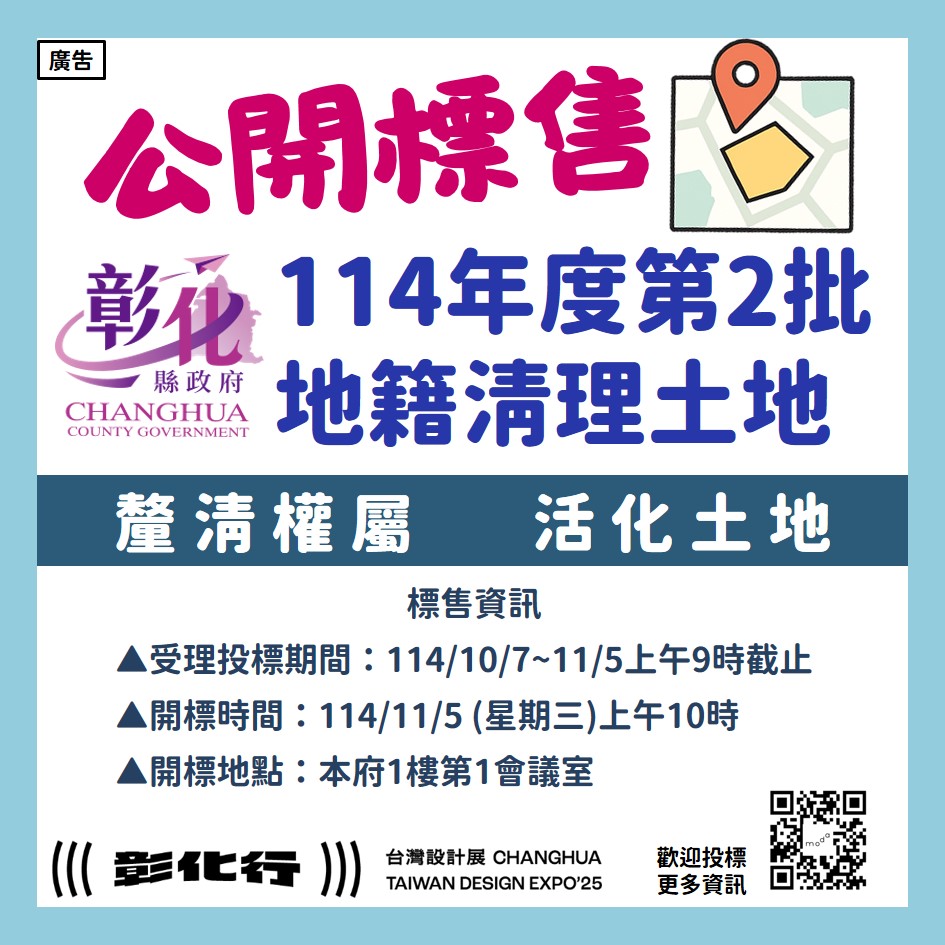 (記者邱暐茹 彰化報導) 彰化縣政府代為標售114年度第2批地籍清理未能釐清權屬土地,自即日起至114年11月4日止公告3個月,受理投標期間為114年10月7日起至114年11月5日上午9時止,並訂於114年11月5日(星期三)上午10時辦理開標作業,本次共公告16標土地,歡迎有意投標且符合投標資格的民眾踴躍參與投標,以免向隅。