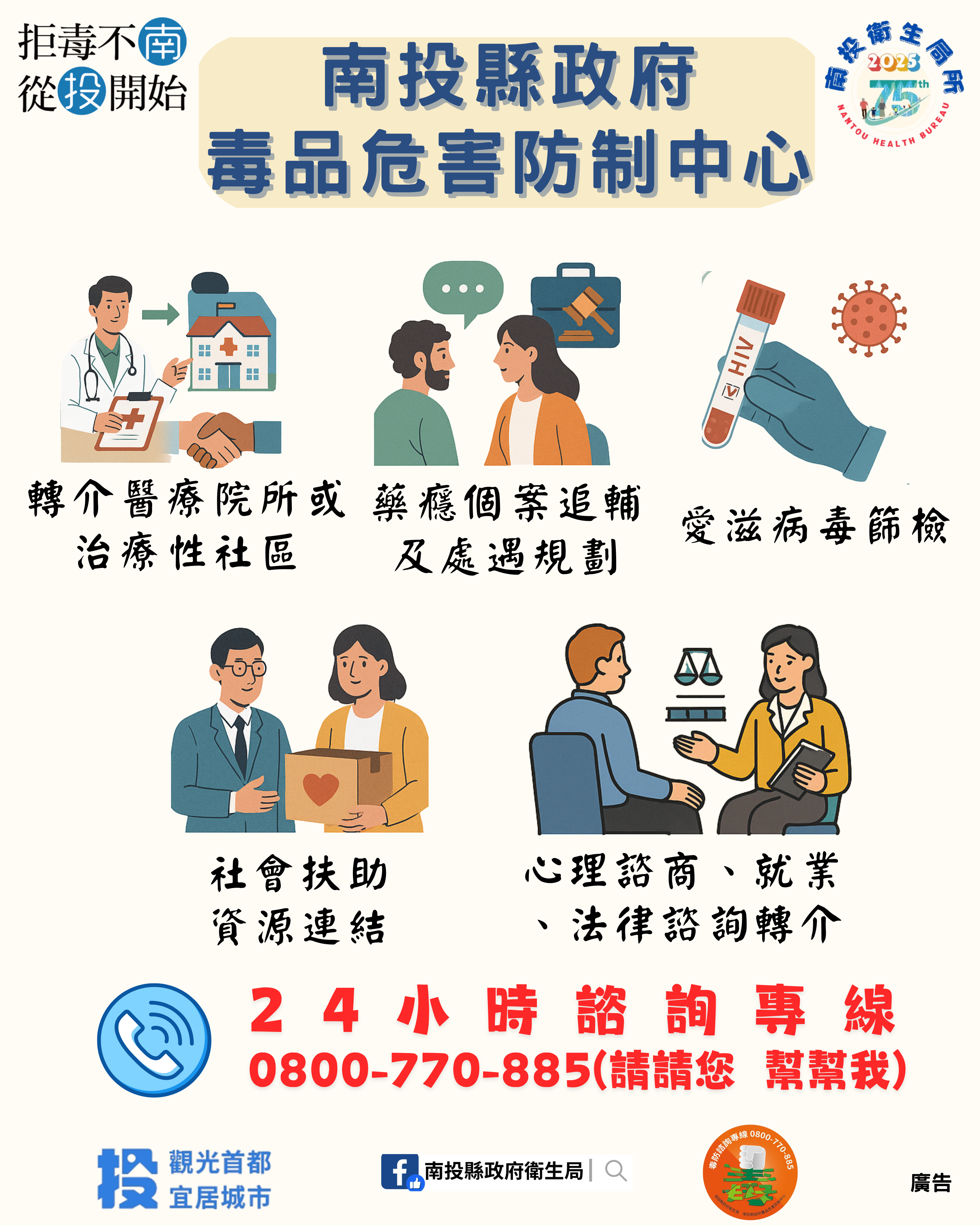 民眾如有藥癮戒治需求,可上網https://ntshb.tw/hc05pE6Ri查詢,或撥打24小時免費毒防諮詢專線0800-770-885(請請您,幫幫我)。