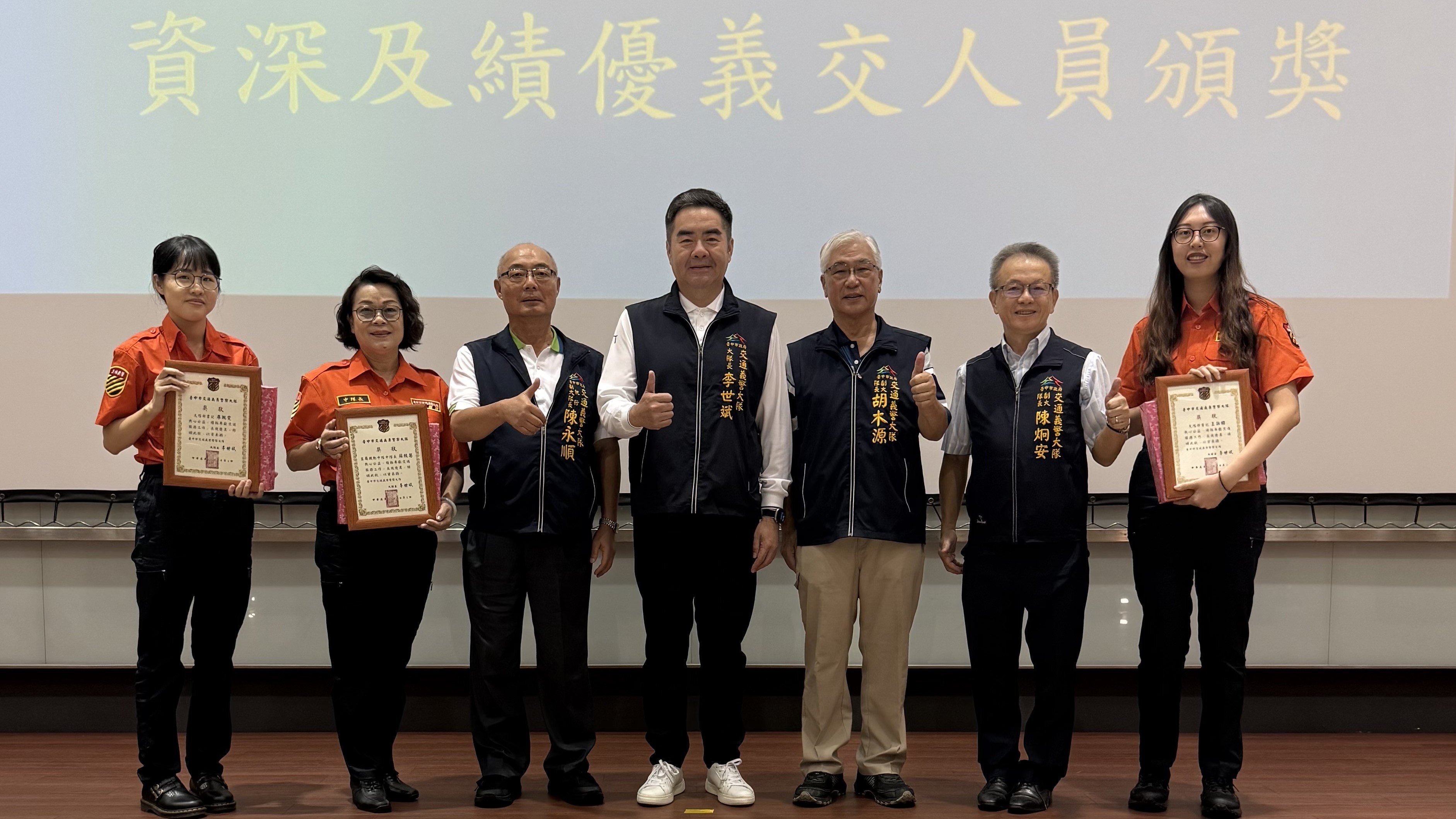 義交大隊大隊長李世斌百忙當中蒞臨現場,頒獎表揚8名年資超過20年以上的資深義交以及19名表現優異的績優義交人員,在致詞時提到,臺中市目前計有19個義交中隊與1,206名義交夥伴,有每位義交同仁的熱心參與,才有今天義交大隊的組織規模,同時也感謝義交同仁長期協助警察執行交通工作,對臺中市交通的進步與安全做出卓越貢獻。