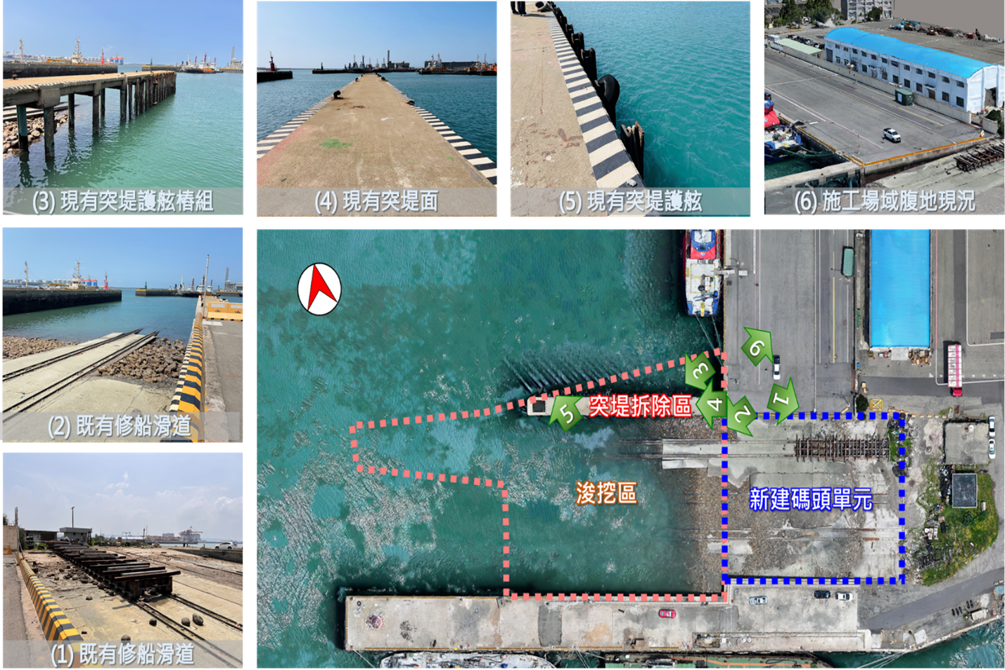 本工程施作位置位於臺中港北碼頭原修船廠區,該區域原設有修船滑道,惟因現代船舶大型化,已無法滿足現行營運需求。為有效提升港區設施使用效益,臺中港務分公司規劃將原修船滑道區域轉型升級為具備現代化機能之碼頭設施,強化服務量能與作業效率。