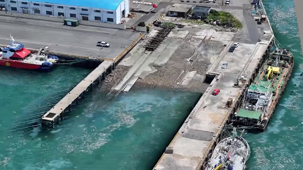 本工程特色包括:新建總長約36公尺、設計水深3公尺之鋼管板樁式碼頭;建置岸水、岸電等公共設施;拆除既有長約52公尺之突堤結構以及既有修船滑道區域。本工程自民國114年1月開工,預定明(115)年1月底前完工啟用,截至目前完成滑道區域浚挖約80%、突堤拆除100%,鋼管板樁與錨定樁打設作業已全數完成,另碼頭結構(含冠牆施作等)正同步推進中。全案將於預定工期內如期如質完成,屆時將有效提升港區作業彈性與服務效率,展現執行團隊積極推動與確保品質並重的成果。