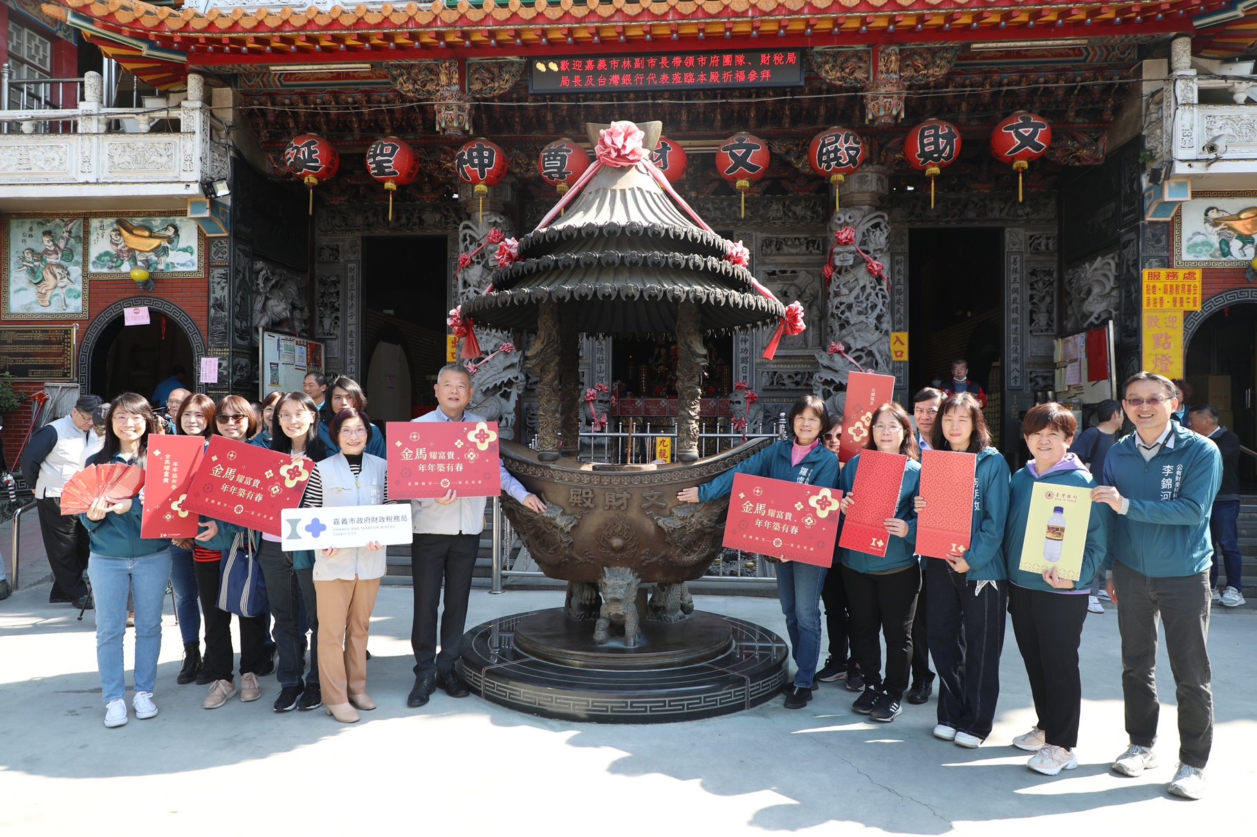【特派員林昱宏嘉義市報導】迎接2026丙午馬年,嘉義市政府財政稅務局限量推出「金馬耀富貴」紅包袋與幸福米,並攜手臺灣銀行嘉義分行提供象徵財富源頭的「發財水」,14日於嘉義文財殿舉行祈福儀式,由副市長林瑞彥代表市長黃敏惠出席,與臺灣銀行嘉義分行副理劉信榮一同參香祈福,祝福嘉義市各行各業金馬奔騰、富貴臨門。
