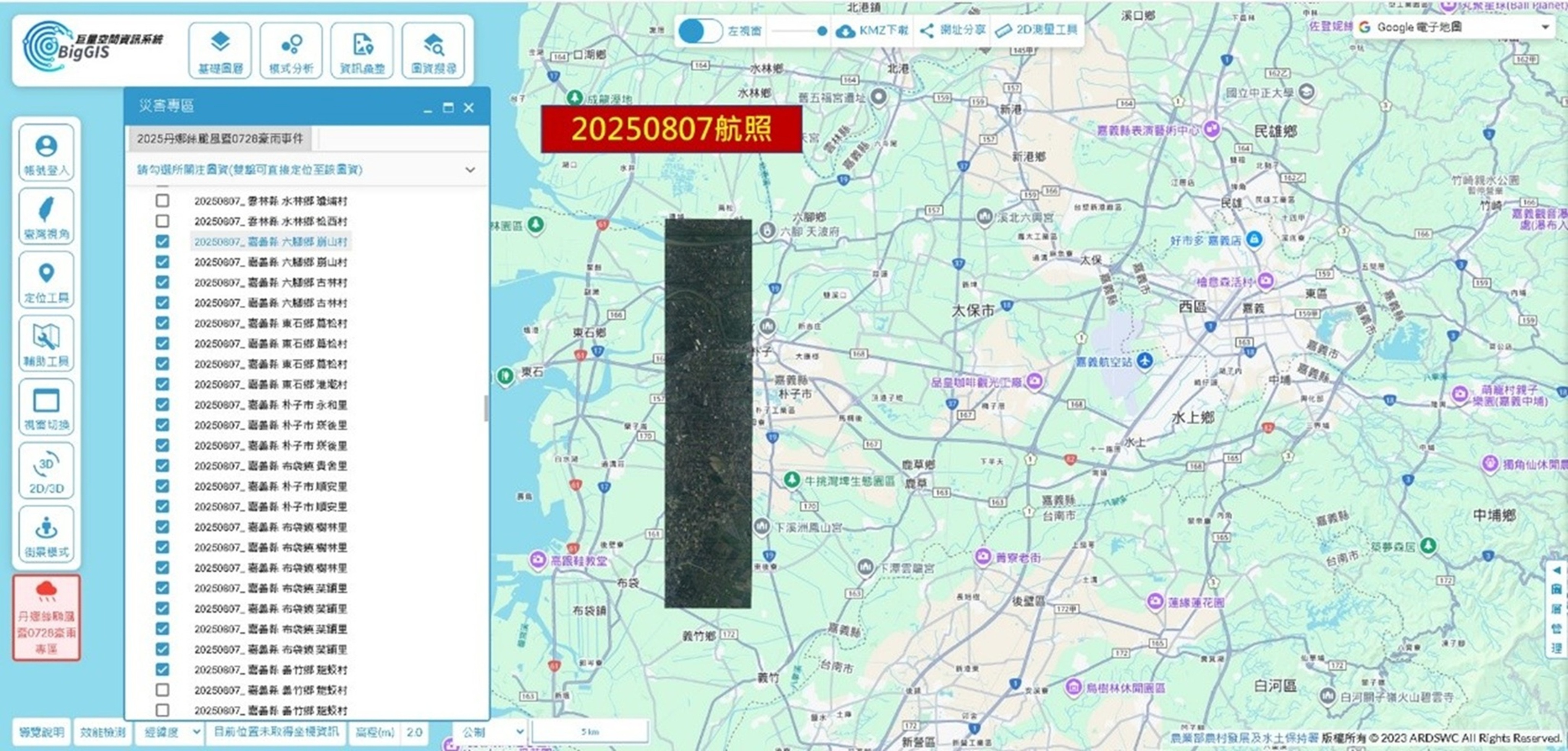 為協助加速民宅損壞修繕進度,本署依據行政院災害防救辦公室指示,將林業保育署航遙測分署空拍成果上架至BigGIS平台(https://gis.ardswc.gov.tw/),並套疊門牌、地籍等圖資,協助臺南市政府快速查詢比對。農村水保署BigGIS平台上已建置完成「丹娜絲颱風暨0728豪雨專區」,蘇代理署長並感謝國土測繪中心同仁於假日協助完成路名、地址及地籍圖資介接,提升資料應用效率,再次展現中央與地方及跨機關協作的公部門合作機制。