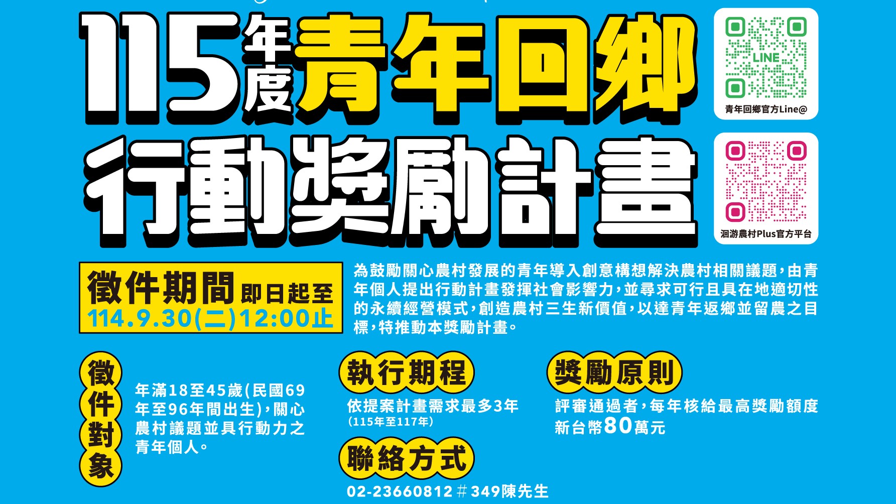 「115年青年回鄉行動獎勵計畫」即日起開放徵件!!